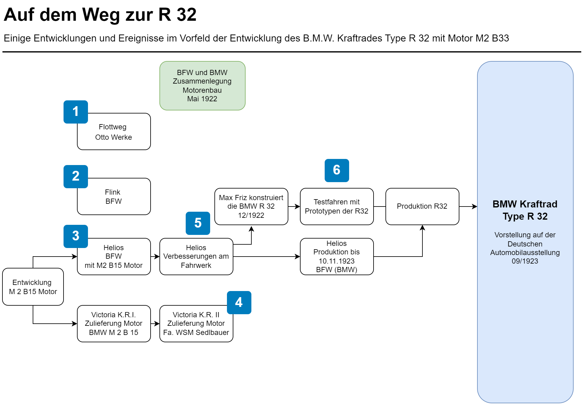 Die folgende Grafik zeigt Ereignisse und Entwicklungen die im Vorfeld der Präsentation auf der Deutschen Automobilausstellung 09/1923 stattgefunden haben. Eine Info zu den Ziffern folgt unterhalb der Grafik.