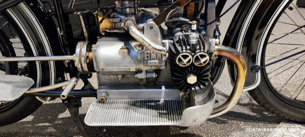 Und endlich der Gipfelpunkt der Ausstellung, die neue BMW Maschine (494 ccm) mit quer zur Fahrtrichtung gestellten Zylindern, eine trotz ihrer Jugend auffallend schnelle und erfolgreiche Maschine.