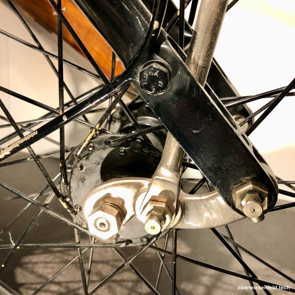 - Keine Bremse im Vorderrad. Die Handhebel der Vorderbremse wirkte zusammen mit der Fußbremse auf eine Keilscheibe (450 mm) am Hinterrad.